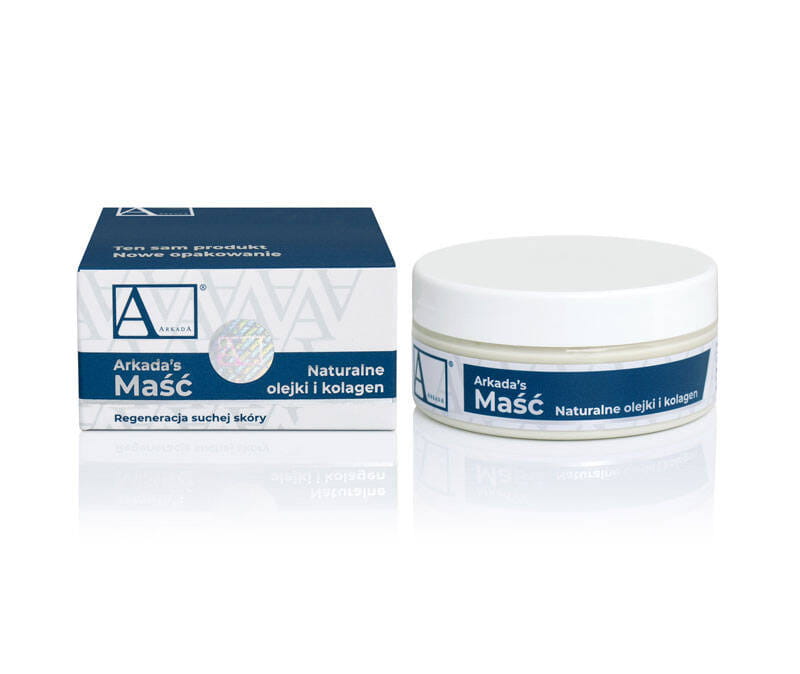 Arkada's Maść z naturalnymi olejkami doskonale regeneruje, daje uczucie ulgi, a także intensywnie natłuszcza oraz odżywia skórę, zwłaszcza stóp, rąk łokci i kolan.