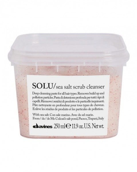 Davines Solu Sea Salt Scrub Cleanser pasta oczyszczająca do wszystkich rodzajów włosów i skóry głowy. Produkt skutecznie usuwa pozostałości kosmetyków i zanieczyszczeń środowiska. Włosy stają się sprężyste, a uczucie czystości włosów jest długotrwałe. Zawarta w produkcie sól morska pochodząca z gospodarstwa Slow Food pana Culcasi w Paceco na Sycylii, efektywnie złuszcza martwy naskórek. Granulki jojoby dodatkowo wchodzące w skład pasty, delikatnie oczyszczają skórę głowy i włosy. Wyciąg z buraków cukrowych odpowiada za prawidłowe nawilżenie oraz powstanie miękkiej piany. Pasta posiada przyjemny zapach, który unosi się na włosach przez długi czas po aplikacji.