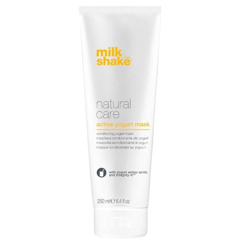 Milk Shake Natural Care Active Yogurt Mask to silnie rekonstruująca maska, głęboko odżywiająca i wzmacniająca suche i zniszczone włosy. Ponadto specjalne składniki aktywne, proteiny jogurtu, aminokwasy, wzmacniają i poprawiają strukturę włosów. Dodatkowo oleje z awokado i ryżu, miód, ekstrakty z owoców i witamina E poprawiają ich kondycję. Ponadto ekskluzywny kompleks Integrity 41® poprawia stabilność koloru, pozostawiając włosy miękkimi i pełnymi blasku.